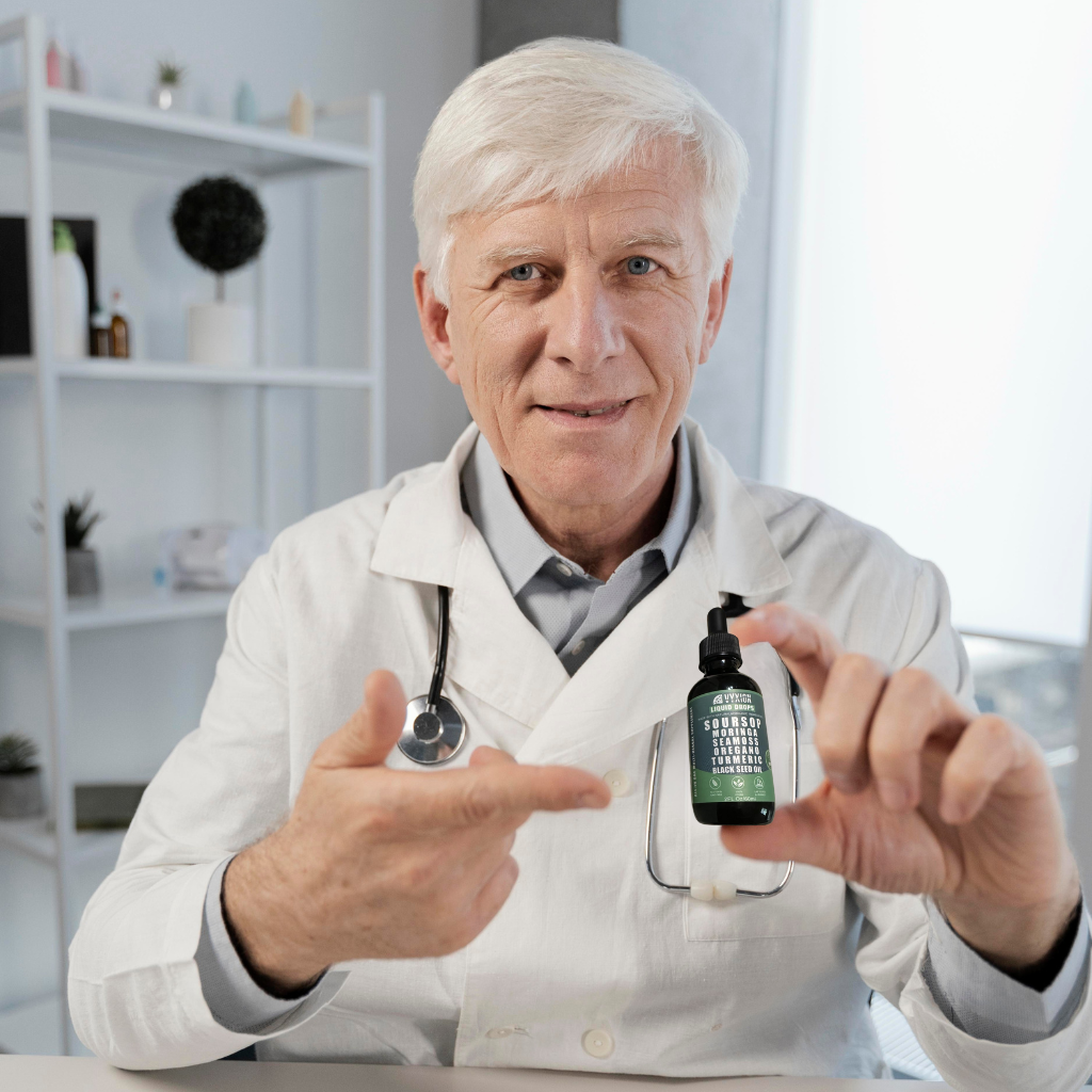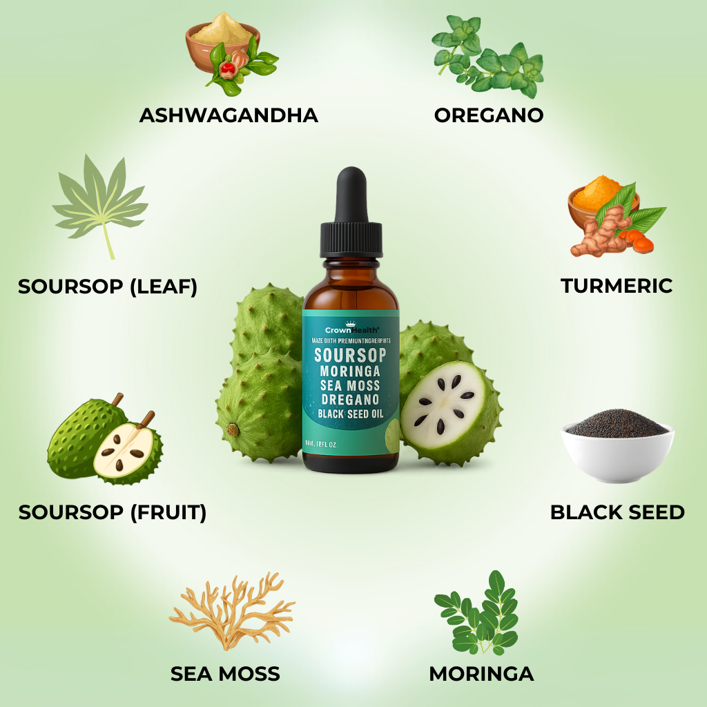 A 10-in-1 herbal blend featuring Soursop, Sea Moss, Moringa, Turmeric, Black Seed, Oregano, Ashwagandha, and more — all chosen for immune, digestive, and energy support.